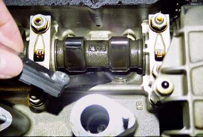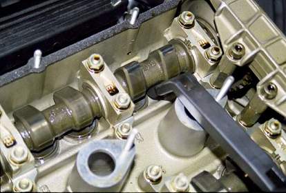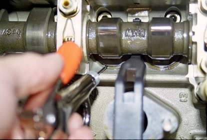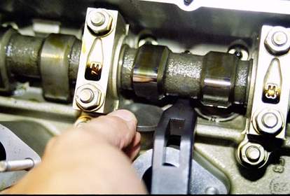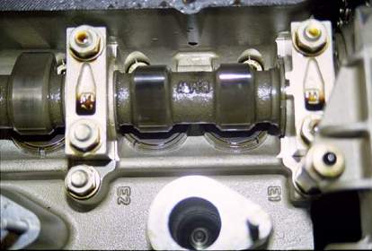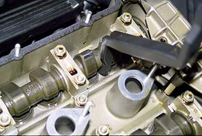 Checking Valve Clearance: 10. Valve clearance specifications should be indicated on a sticker on the driver's side shock tower. This sticker recommends 0.28mm to 0.33 mm (0.0110" to 0.0130") cold for both intake and exhaust. 11. Starting at cylinder number one (closest to the front of the car), rotate the engine with the 36mm socket on the crank until the intake cam lobes (the pointy parts) point up at you (picture 4). 12. Using the feeler gauge, measure valve clearance for each of the two valves between the cam and valve shim (picture 5). Record this measurement. 13. Repeat this procedure until all intake valve measurements have been taken and recorded. 14. Repeat this procedure for all exhaust valves. Removal and Replacement for Out of Spec Shims These steps need only be performed for shims that are out of spec. Follow the same steps for removing either single (i.e., one valve) or both (i.e., both valves) shims on a single cylinder. With careful planning it might be possible to "recycle" out of spec shims from some valves on other out-of-spec valves. However, be sure not to rotate the engine (even by hand) without shims in every valve bucket, or damage to the cam lobe may result. 15. Rotate the engine until the cam lobes on the out-of-spec shims point up at you (picture 4). 16. Rotate the valve buckets for the shims that need to be removed until the slot in the upper edge of the bucket faces the corner of the head casting (picture 4). This is done so these slots will be facing you when you depress the buckets with the tool. 17. The Valve bucket compression tool has two hooks, one on either end. These hooks are used to lever the tool under the camshaft and depress the valve buckets (both valves on one cylinder at the same time). Each hook has a ridge, or spline, cast into the back of it. These splines are different widths and make the hooks intake and exhaust specific. The hooks are not interchangeable. The intake spline is the wider of the two (picture 6). 18. Insert the Valve bucket compression tool between the cam lobes on the desired cylinder, being careful to center the hook's spline between the two buckets (picture 7). Carefully press down on the tool until the valve buckets have been fully depressed (the tool will bottom out on the spark plug shaft, picture 8). 19. Using a small nipple (like the one used to fill a football), blow compressed air through the slot in the valve bucket and under the valve shim (picture 9). This should dislodge the shim from the bucket. 20. Remove the shim with a suitable tool (e.g., magnet, small pliers) and measure with calipers or micrometer . It is best to plan to measure worn shims versus reading the thickness off the back, since very worn shims will vary from the stated thickness and may have their markings worn off. 21. Add existing valve gap to existing shim thickness and subtract desired valve gap to get new shim thickness. For example, if a valve gap measured 0.38mm, and the shim measured 3.6mm, and the desired gap was 0.28mm (any value in the manufacturer's range is okay), the new shim would measure: 0.38 + 3.6 - 0.28 = 3.70mm. Thus, the new shim would need to be 3.70mm thick. 22. Insert new valve shim into bucket (just slide it in, picture 10). Repeat for second valve if necessary. 23. Carefully lift up on the Valve bucket compression tool to release compression on valve buckets. 24. Repeat procedure for all affected valves. Buttoning Up: 25. Reinsert spark plugs in holes they were removed from and tighten to specification. 26. Clean all gasket surfaces thoroughly. 27. Carefully install new spark plug hole gaskets (2) and valve cover gasket. 28. Carefully install valve cover. Install eighteen (18) 10mm acorn nuts with wave washers. 29. Insert spark plug wires into appropriate holes and press firmly to connect. Bolt down the spark plug harness (careful not to dislodge the brass inserts) with the two remaining 10mm acorn nuts and wave washers. Reposition the distributor cover and reinsert the three (3) 8mm bolts and wave washers into the holes. Tighten to specification. 30. Reinsert the valve cover vent hose and tighten clamp. 31. Reinstall fan or lower airbox assembly (ensuring the mass air and altitude sensor plugs are properly connected) 32. Remove tire chocks. 33. Enjoy! |