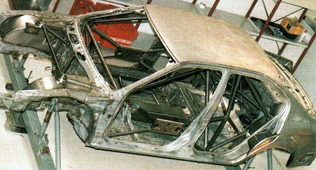 This is a photo of the roll cage construction in the very successful Nissan Primera which was built for the BTCC 1998 season. There are some interesting things to note if one looks carefully: The Primera used MacPherson struts at all four corners in 1998. They have since been forced to revert to a beam axle in the rear for the 1999 season because the Japanese version 4wd suspension clause ran out. Check out the reinforcement of the front strut towers. Although the rules limit the amount of fender mod's allowed (almost nothing in 1998) check out the way they re-fabricated the front inner wheel wells in order to cram those 19" wheels under there. Note that they DO employ a diagonal tube in the main hoop. But no harness bar and no seat brace (the driver sits on the right). Look at the way the cage ties into EVERY rear suspension pickup. Note the tubes running just below the A-Pillars. They go straight from the dash area to above the driver's head - no bends. They also use the standard forward bars tucked into the A-Pillars but they are difficult to see in this picture. The straight tubes feed the loads from the front suspension straight into the back of the cage. Because they are straight, the load path is direct and the tubes do not bend under compression. |