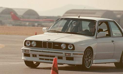 ![]() This photo was taken at Norton AFB by Genevieve Liang. The car is negotiating a relatively quick right hand sweeper taken just short of redline in second gear. Even with worn out old Toyo T1 street tires and stock anti-roll bars, my M3 still lifts its inside front wheel most of the way off the tarmac. This is a typical characteristic of rear wheel drive cars. It is caused by the relatively high front roll stiffness which is usually required to get good balance in a RWD car. |