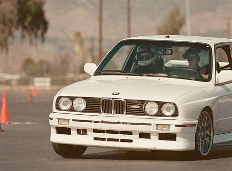 ![]() This photo was taken at Norton AFB by Genevieve Liang. The corner is a slow and tight 180° hairpin. Note that I am looking way ahead to the next corner. This is something that took me forever to learn. But it is so crucial to success when auto-crossing. My buddy James is in the passenger seat. He seems to be fixated on the row of cones dead ahead and is thinking "We're never going to make this turn!" |